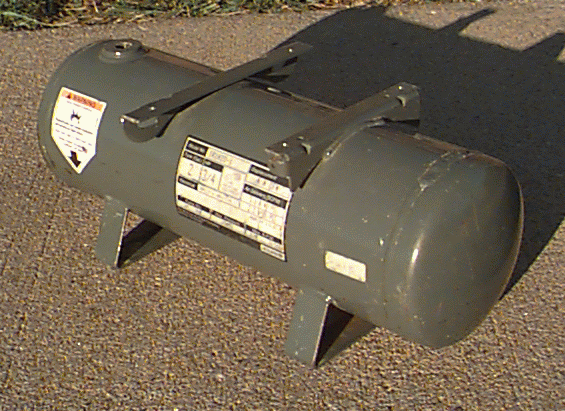 Some people weld shut the ends of their tube bumpers, nerf bars, or roll cages and tap a hole to mount the air fittings. For example, a 36" long, 3" diameter tube will hold 1.1 gallons of air. This is a great idea, if you have such things on your vehicle. I don't (yet). I opted for a used 6"x19", 2-gallon tank from an old portable air compressor rated at 125 psi. I picked this up at a local air compressor repair shop for $30. It even came with the necessary brackets already welded onto it, as well as two threaded holes containing a drain plug, quick disconnect fitting, and 150 psi pop-off safety valve. I just had to drill the mounting holes and cut off any brackets I didn't need.