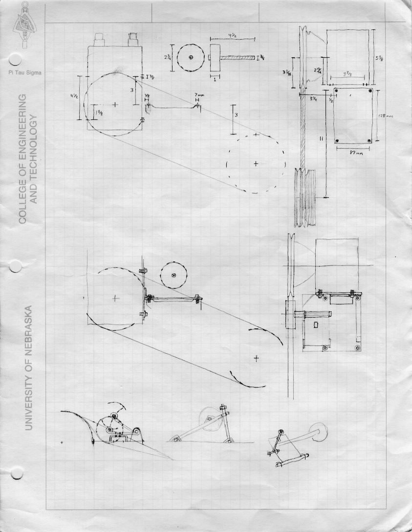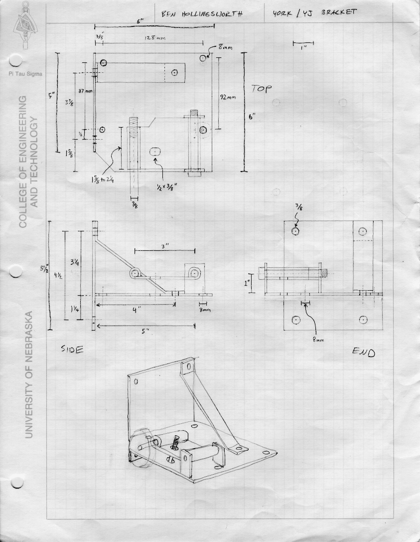 Mounting the York to an old Jeep with a 258 ci inline-6 should be pretty easy, since this compressor was available from the factory. Just grab the OEM brackets from another 258 with A/C and you're good to go. Mounting it on any other engine requires fabrication of a custom mounting bracket. Complete mounting brackets for newer Jeep engines are available for $200+ from Therold Enterprises. If that's too steep for you, they'll sell you just the backplate for the compressor, with slots drilled for adjustable mounting bolts, for $12. If you're the do-it-yourself type, you could also fabricate your own design. Craig Myers has a good design for mounting to his '93 YJ 4-cyl that I believe is similar to what Therold sells. I ended up with (essentially) two 6x6x3/16" steel plates welded together to form a T. A diagram with mounting hole measurements is on page 1. Measurements of the alternator bracket, compressor, and pulleys without the compressor bracket is on page 2.