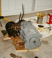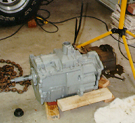 This is Darren's NV4500 from under while bolted to the bell housing. Note the Advance Adapter tailhousing on the back and also the PTO cover on the right side. This is the 1996 4WD Dodge transmission with stock 23 spline output shaft. It's ready to bolt on a Dana 300.