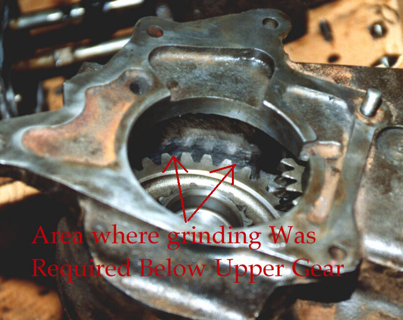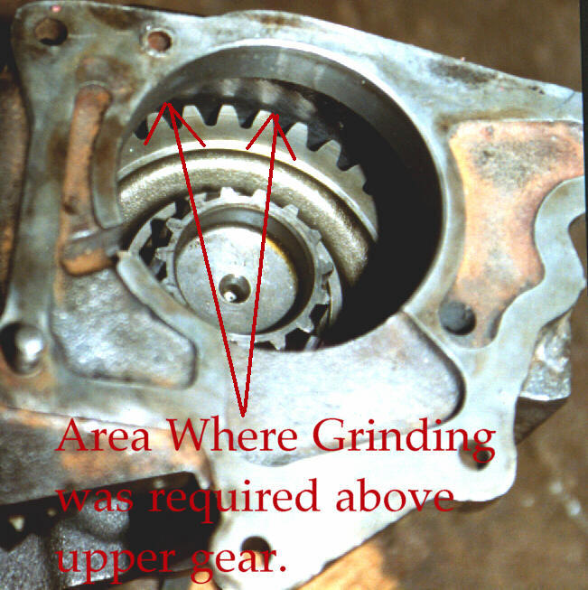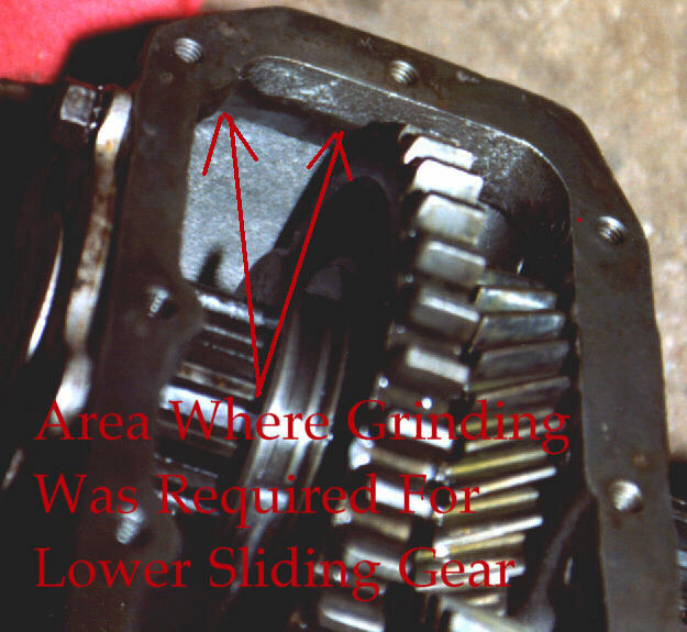 Here are some pictures that will give you an idea of how little grinding was required. Grinding was required only directly above and below the upper sliding gear and on the lip near the sheet metal cover for the lower sliding gear.