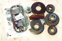 The gear set arrives in a well designed shipping box with foam inserts to protect the gears from damage during shipping. A gasket and seal kit, small parts kit, new center shaft and needle bearings, the gears themselves and very detailed instructions are contained in the box. The instructions cover the disassembly and re-assembly of the transfer case and are very thorough. No special tools are need to disassemble the transfer case, but a short length of 1-1/4" OD pipe, tubing or wooden dowel is necessary to hold the needle bearings in place during assembly.