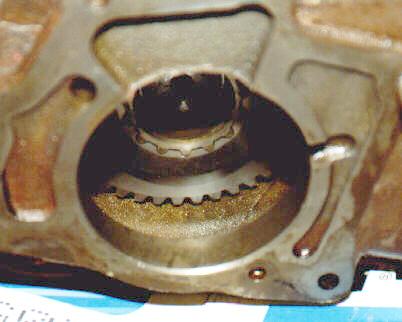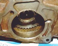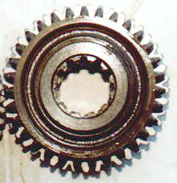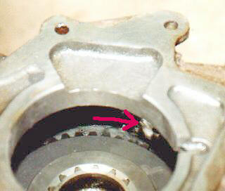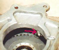 Tera gear slid all the way onto the rear output shaft. The arrow points to area where the ridge was ground away.