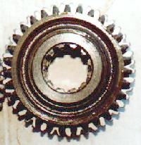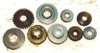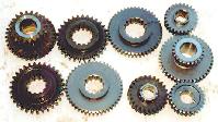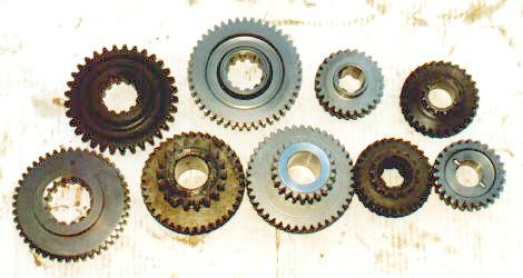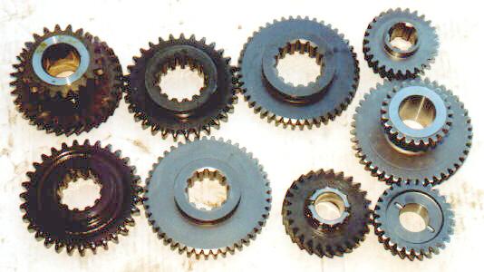 Tera gears next to factory 2.03:1 low range Dana 20 gears. The shiny new gears are from Tera. Note how much thicker the teeth are on the Tera sliding gears compared to the originals.